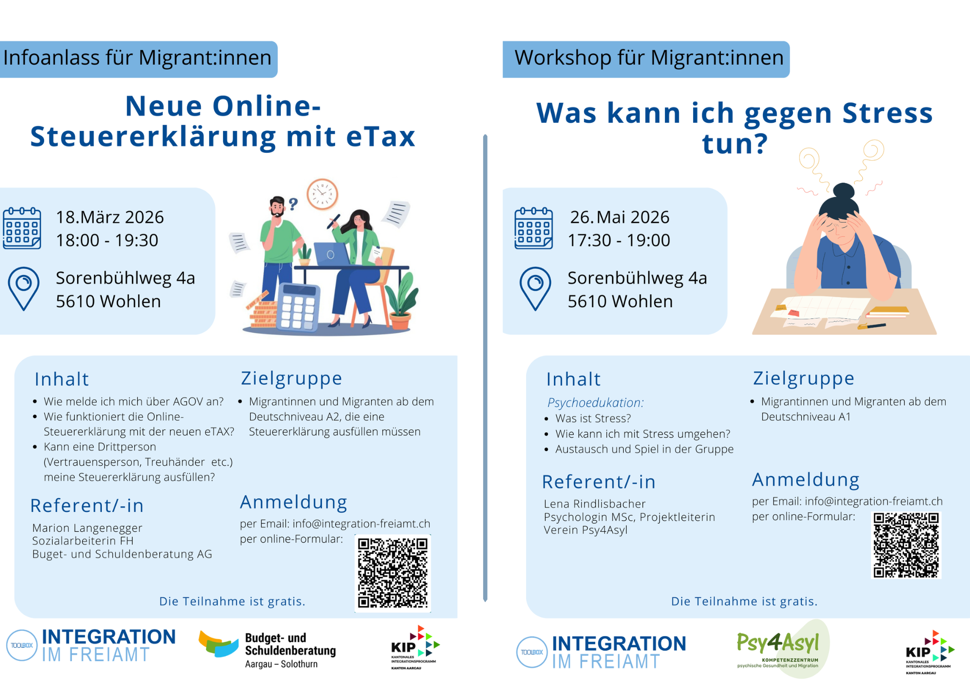 Die Fachstelle Integration im Freiamt veröffentlicht das Monatsprogramm für den Bezirk Bremgarten mit den Angeboten: