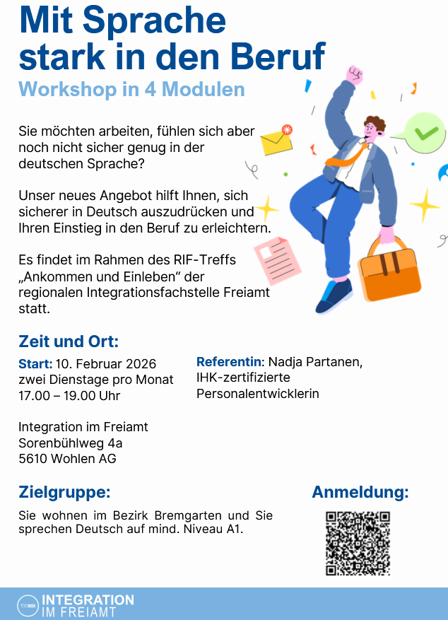 Der Workshop „Mit Sprache stark in den Beruf” ist Teil des RIF-Treffs. Er startet am 10. Februar 2026 und wird an zwei Dienstagen pro Monat durchgeführt. Wenn Sie aus dem Bezirk Bremgarten kommen und mindestens das Niveau A1 in Deutsch erreicht haben, können Sie sich über das Online-Formular anmelden. Es gibt nicht viele freie Plätze.
